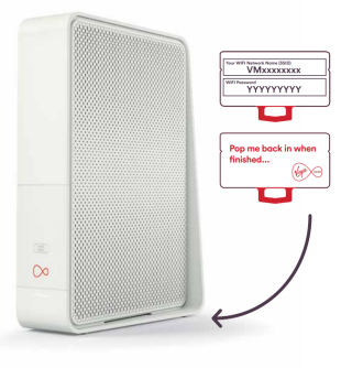 If you're using Virgin TV as your broadband modem, the network name and password are written underneath the Virgin TV box on a white sticker.