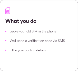 • After you click 'Send code by text now', we'll send a text to your current mobile phone with a 4 digit verification code to prove that you are in possesion of the number you want to switch. Just enter the code in the text field on the next screen.