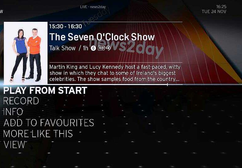 ReplayTV is available across the most loved Irish TV from RTÉ One and RTÉ 2, Virgin Media One and Virgin Media Two. But this is only the beginning and we will constantly add new channels. Just scroll through the backwards EPG, select the show you’d like to watch and press play. Replay TV will be available on 11HD and 12 SD channels at launch.
