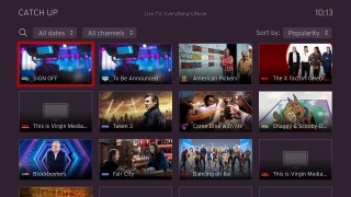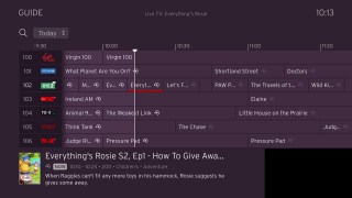 Meet your sofa sherpa. Virgin TV 360’s super-slick, super-simple Guide makes finding your way round a doddle so you spend less time looking and more time watching. Plus, it works exactly the same way whether you’re on your main TV, phone or tablet You can navigate in single programme intervals using the left and right arrows or in 24 hour intervals using the rewind << and fast forward buttons >>. You can move up and down the Guide in single channel steps using the arrow buttons or jump one page at a time using the channel up and down buttons. You can also change the Guide view from “All Channels” to the genre of your choice for faster searching. To change day or genre press the Home button from within the Guide.